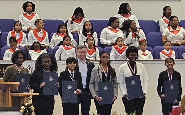 In special recognition, Congressman Eugene Vindman congratulated the orators and the organizers as they celebrated the 41st anniversary of the MLK Oratorical Competition. He presented the regional winners with certificates to be entered into the Congressional Record.